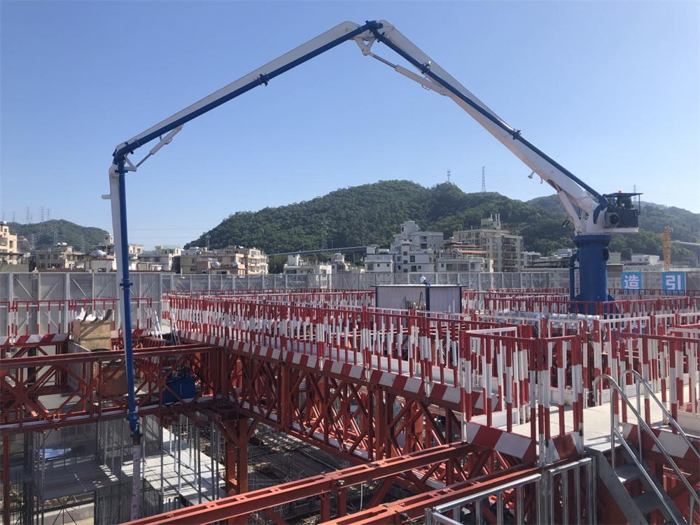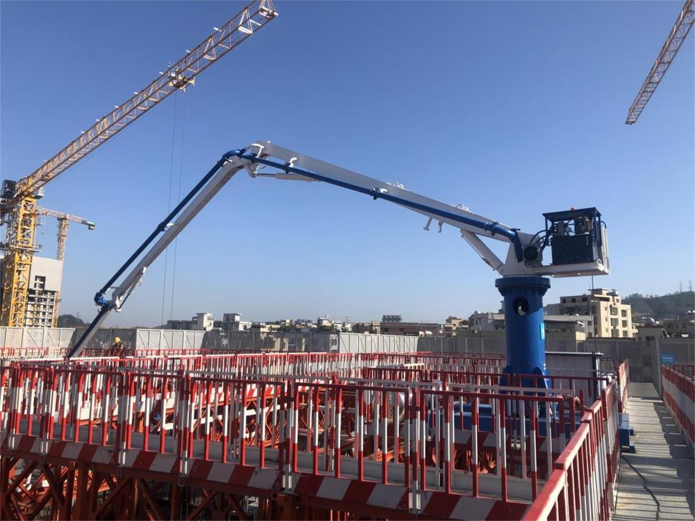 模架式液壓混凝土布料機(jī)自帶鋼平臺(tái)底座,與爬模架體連接傳遞施工載荷,無(wú)需自帶動(dòng)力系統(tǒng),爬模爬升時(shí)帶動(dòng)其爬升。其中HGY21模架式液壓混凝土布料機(jī)于2021年11月成功應(yīng)用在使用“住宅造樓機(jī)”的裝配式建筑領(lǐng)域(中建三局承建的廣州大源村項(xiàng)目)。