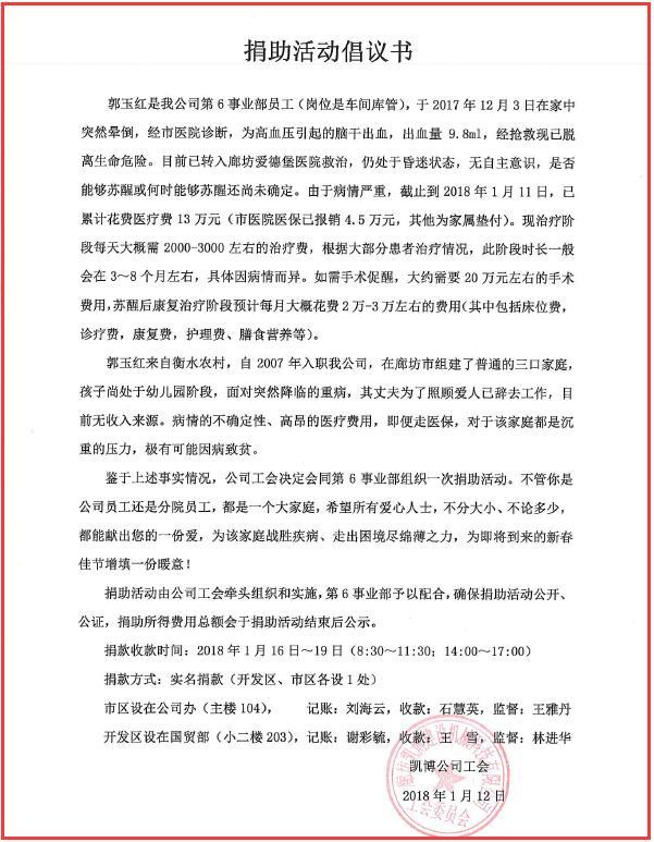一方有難,八方支援。我公司第六事業(yè)部員工郭玉紅(崗位是車間庫管)于2017年12月3日在家中突然暈倒,經(jīng)市醫(yī)院診斷,為高血壓引起的腦干出血,經(jīng)搶救現(xiàn)已脫離生命危險,目前已轉(zhuǎn)入廊坊愛德堡醫(yī)院救治,仍處于昏迷狀態(tài),無自主意識,是否能夠蘇醒或何時能夠蘇醒還無法判斷。郭玉紅來自衡水農(nóng)村,自2007年入職我公司,在廊坊市組建了普通的三口家庭,孩子尚處于幼兒園階段,面對突然降臨的重病,其丈夫為了照顧愛人已辭去工作,目前無收入來源。不論經(jīng)濟層面還是精神層面,病情的不確定性、高昂的醫(yī)療費用,對于該家庭都是極其沉重的壓力,極有可能因病致貧。